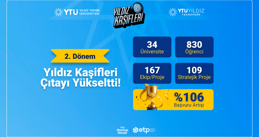 Yıldız Teknik Üniversitesi ve Yıldız Teknopark iş birliğiyle yürütülen Türkiye’nin üniversitelerarası en büyük girişimcilik programı Yıldız Kaşifleri’nin ikinci dönemine, YTÜ öğrencilerinin ekip lideri olduğu proje takımlarına 34 farklı üniversiteden öğrenciler katılım gösterdi. Toplamda 830 öğrenci ve 167 proje başvurusunun yapıldığı programda, proje sayısı ikiye katlanırken milli teknoloji hamlesinin lokomotifi savunma sanayii 50 proje ile ilk sırada yer aldı.