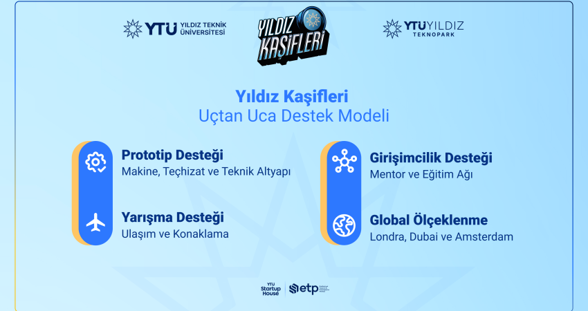 Yıldız Kaşifleri, girişimcilere sunduğu 360 derecelik destek modeliyle klasik startup programlarından ayrışıyor. Girişimcilere, prototip geliştirme süreçlerinde ihtiyaç duydukları makine ve teçhizat temininden uluslararası prestijli yarışmalara katılım için ulaşım ve konaklama desteğine kadar uçtan uca kaynak sağlanıyor. Ayrıca, YTÜ Yıldız Teknopark’ın güçlü mentor ağından ve teknik altyapısından faydalanan takımlar, programın ilerleyen aşamalarında teknoparkın Londra, Dubai ve Amsterdam ofisleri üzerinden küresel yatırımcı ağlarına erişim ve uluslararası ölçeklenme fırsatı yakalayarak yerli teknolojiyi dünyaya ihraç etme fırsatı elde ediyor.