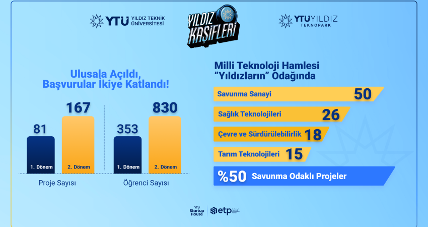 Yıldız Teknik Üniversitesi (YTÜ) ve YTÜ Yıldız Teknopark tarafından üniversitelerarası en büyük girişimcilik programı olarak 2025 yılında hayata geçirilen Yıldız Kaşifleri, ikinci dönem başvurularında çıtayı yükseltti. Geçen yıl 81 takımın başvuru yaptığı programda bu sayı yüzde 106’lık artışla 81’den 167’ye çıktı. Öğrenci sayısı ise 353’ten 830’a yükseldi. Başvuruların yüzde 50’si savunma sanayii odaklı projeler oldu. Milli ve yerli teknoloji hamlesindeki ivme Yıldız Kaşifleri’ne de yansıdı.